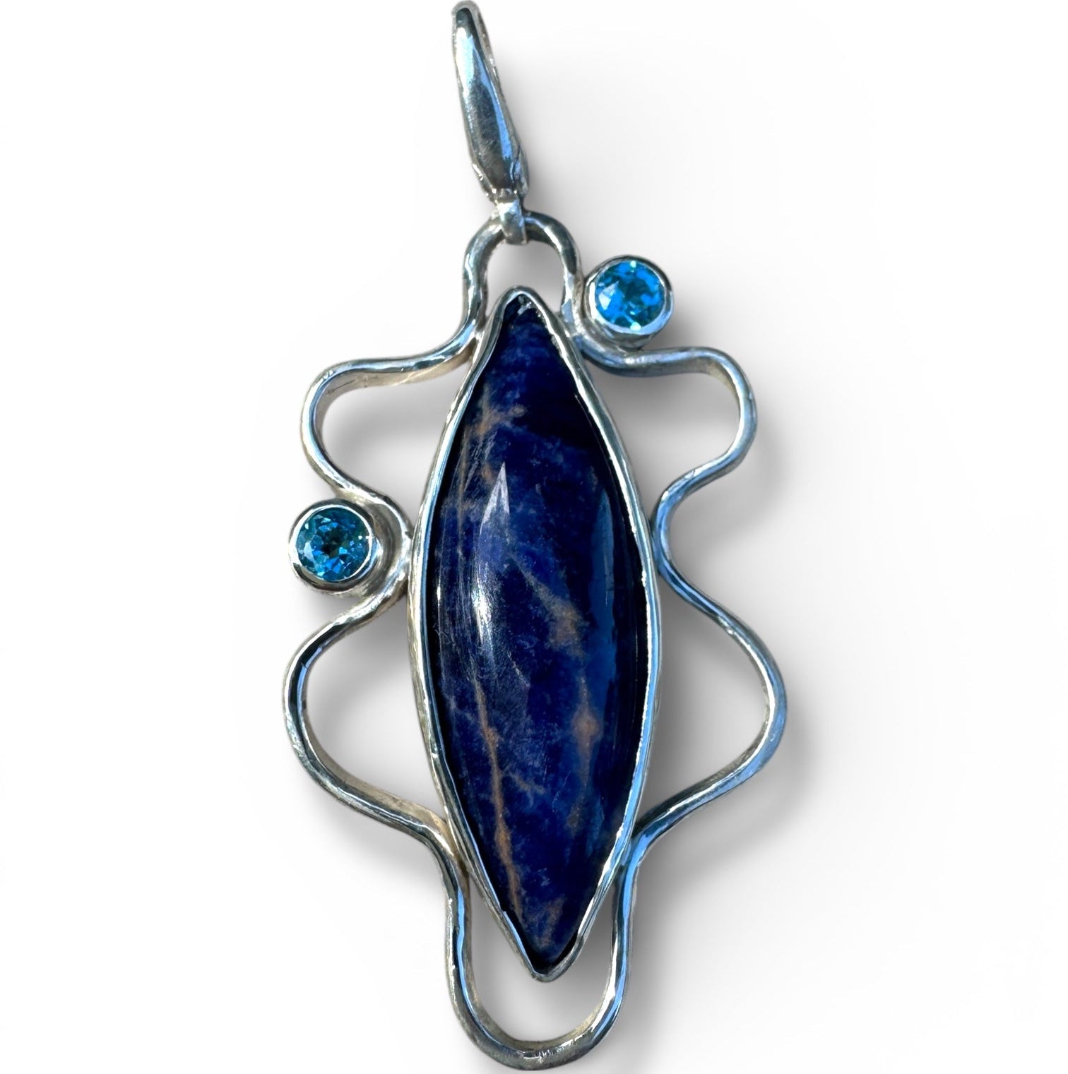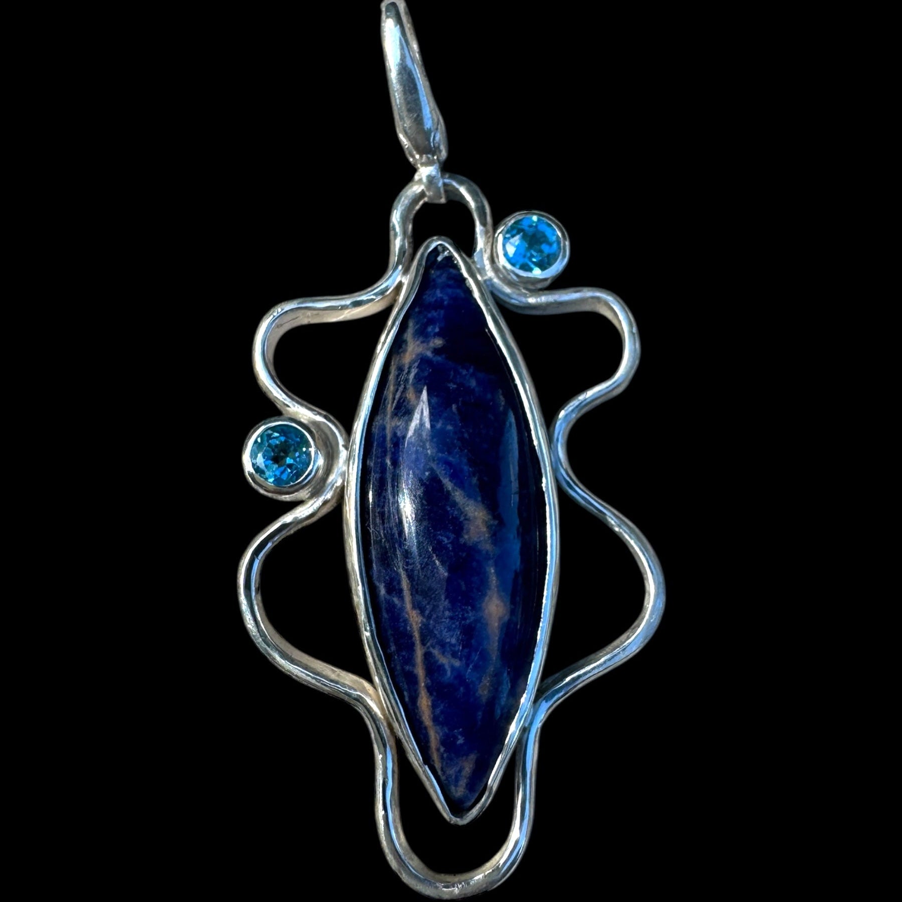At the center rests a polished sodalite cabochon grounding the piece in deep blue tones of clarity and inner knowing. Two brilliant, faceted blue topaz accents are bezel set into the flowing star, catching light with every movement and allowing it to pass through the stone.